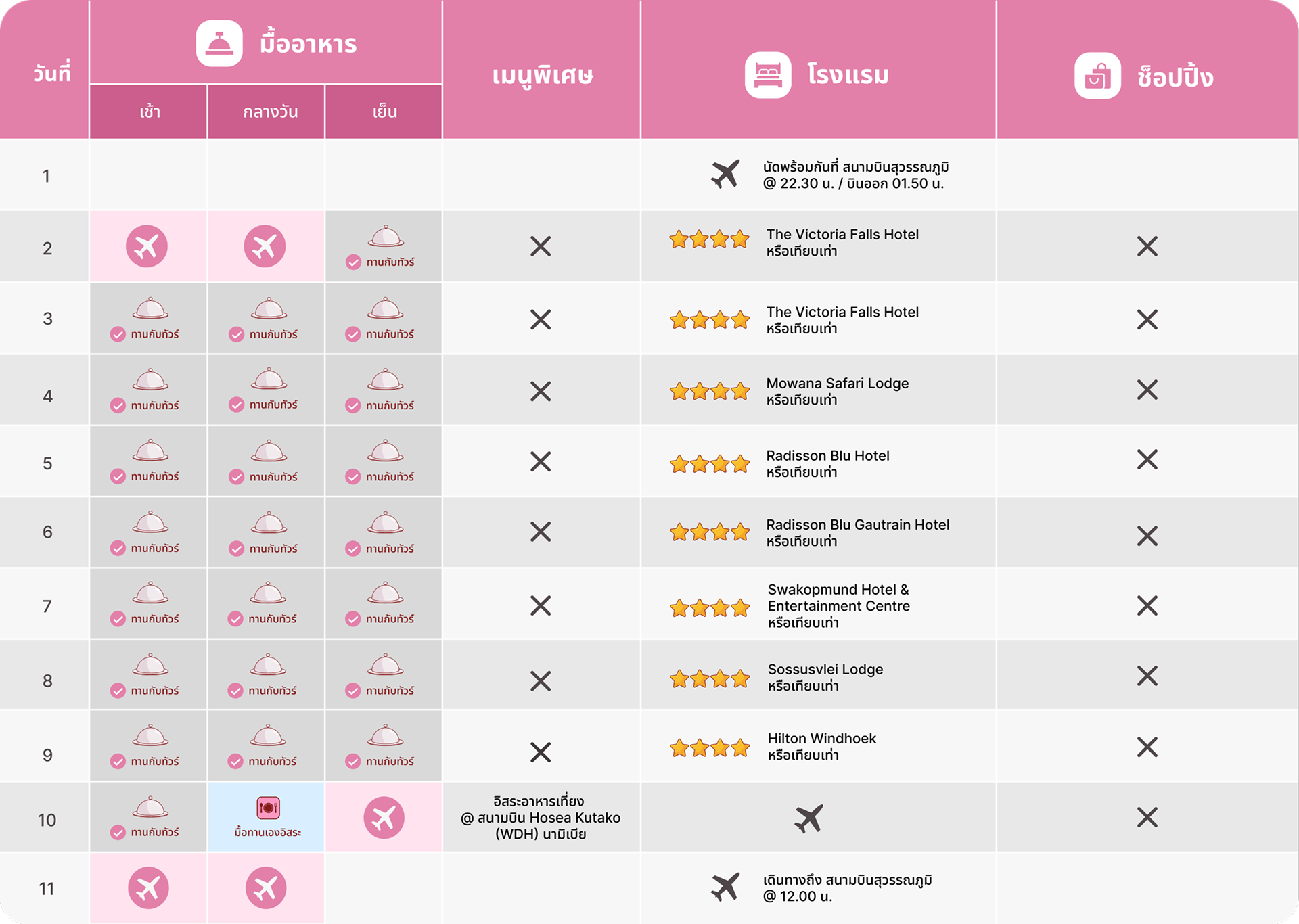 วันที่ 10 | เช้าเที่ยวชม เมืองวินด์ฮุก - ท่านแวะถ่ายรูปกับโบสถ์ประจำเมือง Windhoek Church - ผ่านชมสถานที่สำคัญของเมืองฮะ11.30 น.เดินทางสู่ สนามบินโฮเซอา คูตาโค (Hosea Kutako International Airport)(WDH)14.30 น.ออกเดินทางโดยสายการบิน เอธิโอเปียนแอร์ไลน์ (Ethiopian Airlines)(ET) 21.20 น.เดินทางถึง สนามบินอาดดิสอาบาบา (Bole International Airport)(ADD) ประเทศเอธิโอเปีย *แวะเปลี่ยนเครื่อง22.40 น.ออกเดินทางโดยสายการบิน เอธิโอเปียนแอร์ไลน์ (Ethiopian Airlines)(ET) *ET608 |