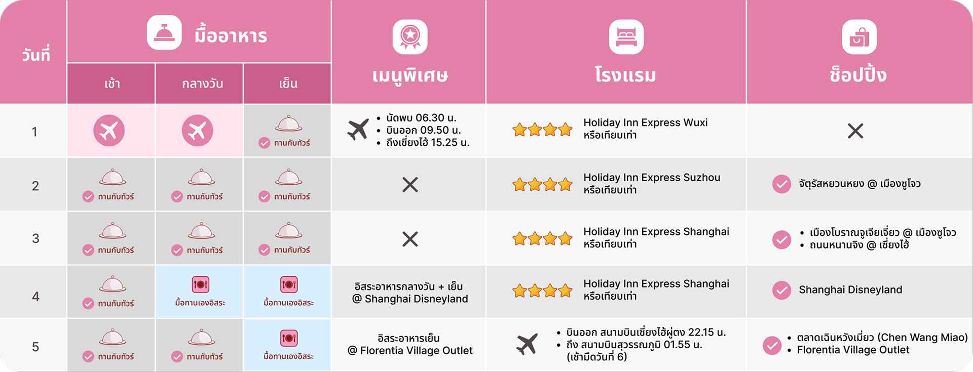วันที่ 5 | เช้าShanghai - อาคาร 1000 ต้นไม้ (Tian An 1,000 Trees) - ร้านกาแฟสตาร์บัค รีเสิร์ฟโรสเทอรี (Starbuck Reserve Roastery Shanghai) - ตลาดเฉินหวังเมี่ยว | ตลาด 100 ปี เฉินหวังเมี่ยว เมืองเซี่ยงไฮ้ (Chen Wang Miao)บ่ายเดินทางสู่ สวนสาธารณะ North Bund Green Land - ถ่ายรูปคู่กับ หอไข่มุก (Oriental Pearl Tower) - อุโมงค์เลเซอร์เซี่ยงไฮ้ (The Bund Sightseeing Tunnel) - ช้อปปิ้ง Florentia Village Outlet | Florentia Village Shanghai | Florentia Village | Shanghai Florentia Village Outlets*อิสระอาหารเย็นฮะ เดินทางสู่ สนามบินเซี่ยงไฮ้ผู่ตง (PVG) 22.15 น.ออกเดินทางโดยสายการบิน เซี่ยงไฮ้แอร์ไลน์ (Shanghai Airlines)(FM) *FM 841 **มีบริการอาหารบนเครื่องฮะ01.55 น.+1(เช้ามืดวันที่ 6) เดินทางถึง สนามบินสุวรรณภูมิ |