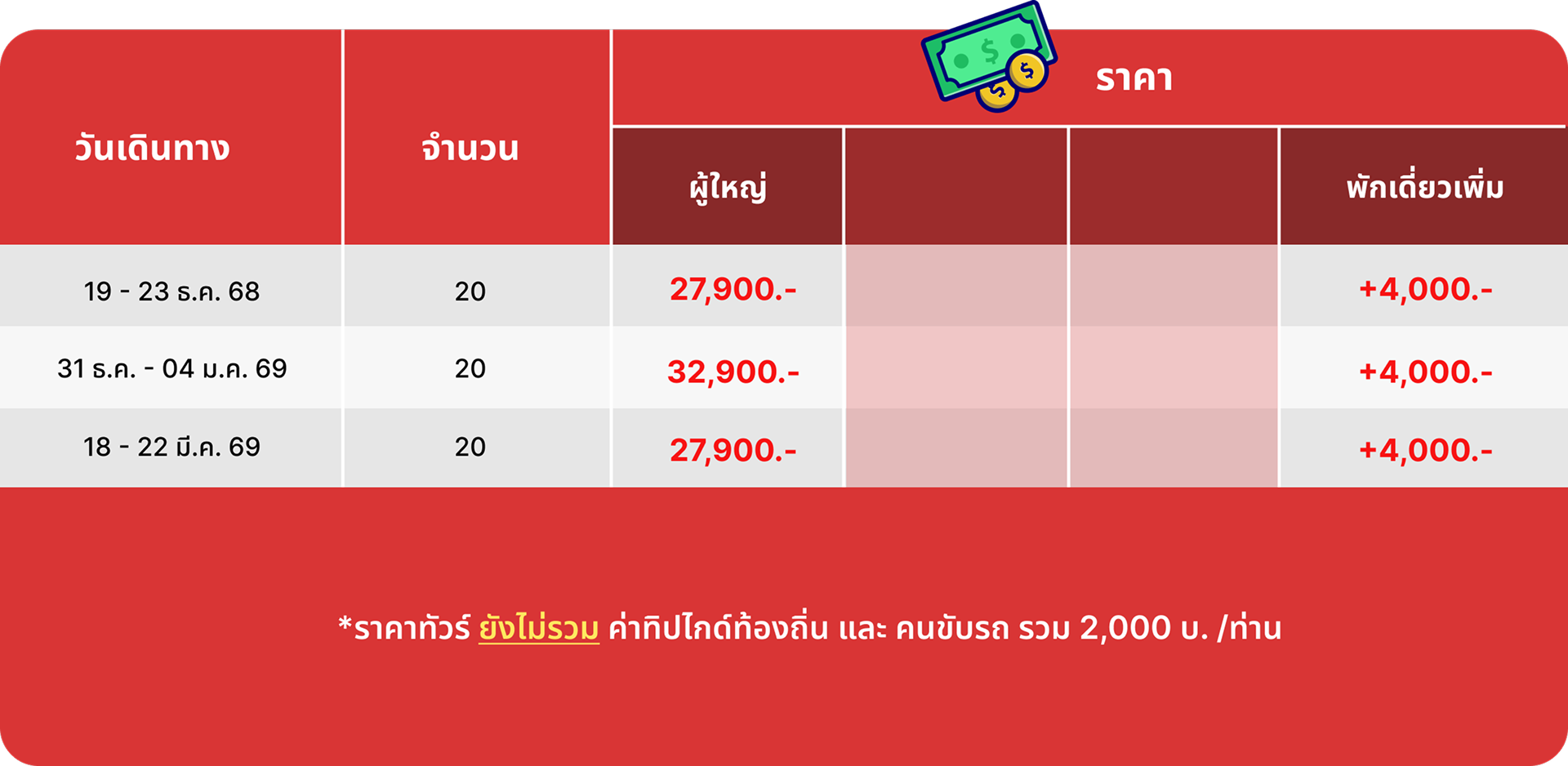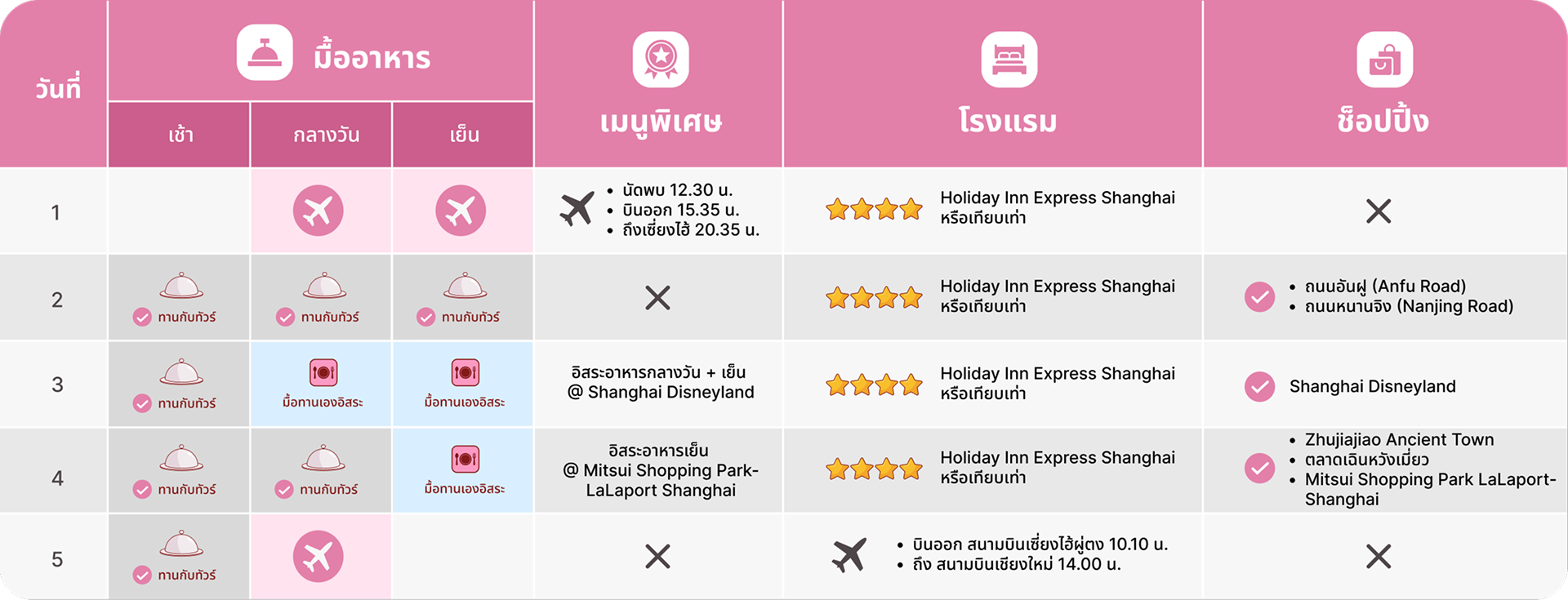 วันที่ 5 | เช้าเดินทางสู่ สนามบินเซี่ยงไฮ้ผู่ตง (PVG)10.10 น.ออกเดินทางโดยสายการบิน ไชนาอีสเทิร์นแอร์ไลน์ (China Eastern Airlines)(MU) *MU205 **มีบริการอาหารและเครื่องดื่มบนเครื่องฮะ14.00 น.เดินทางถึง สนามบินเชียงใหม่ |