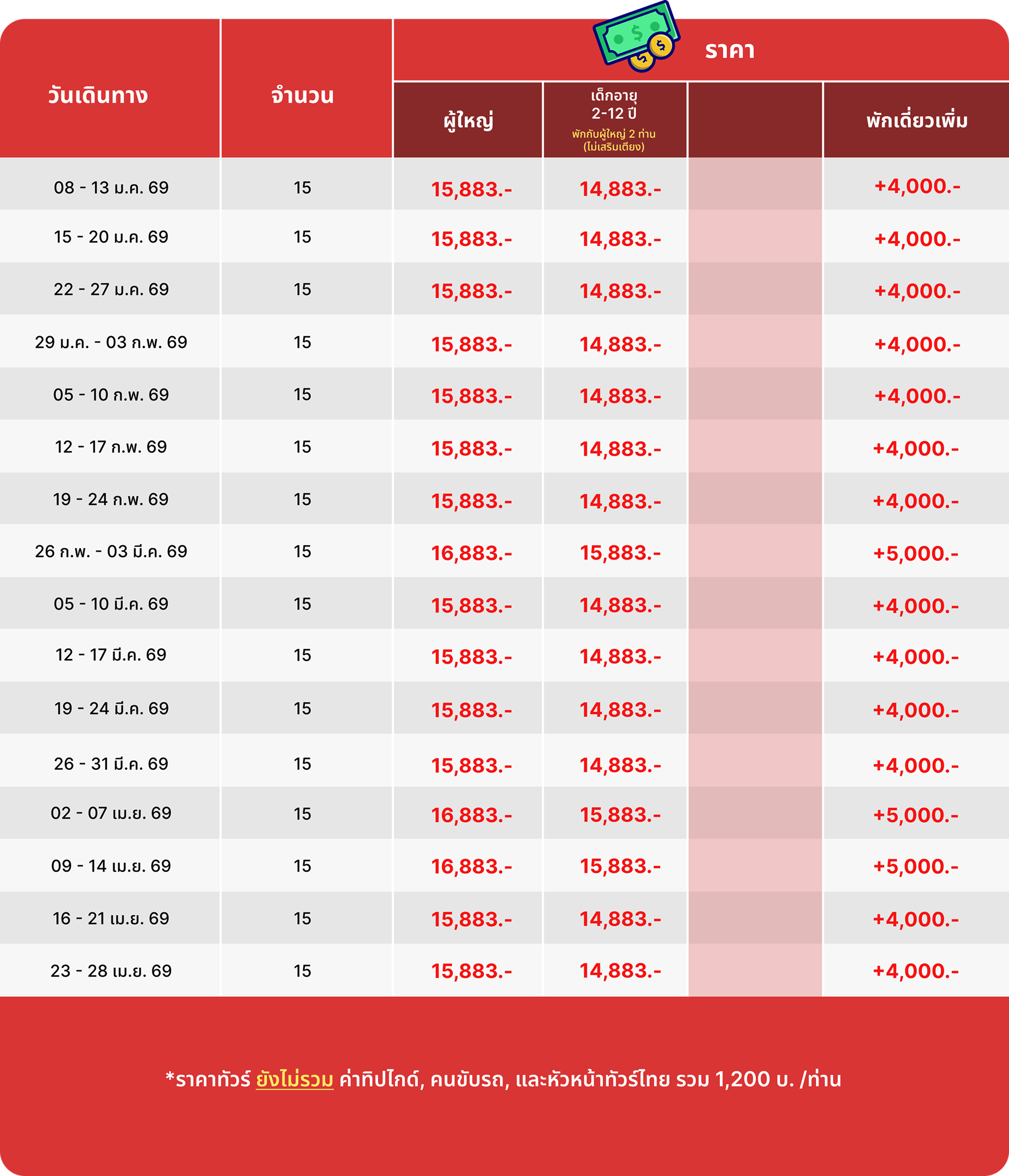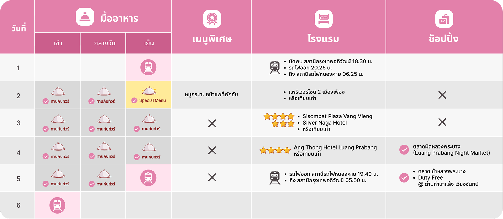 วันที่ 5 | เช้าเมืองหลวงพระบาง - ตักบาตรข้าวเหนียว / ใส่บาตรข้าวเหนียว หลวงพระบาง *รวมค่าใส่บาตร และ ชุดพื้นเมืองผ้าสไบแล้วฮะ - ตลาดเช้าหลวงพระบาง (Luang Prabang Morning Market) - วัดเชียงทอง (Wat Xiengthong) - วัดวิชุนราช (Wat Wisunarat / Wat Visounnararth) - เดินทางสู่ สถานีรถไฟความเร็วสูง หลวงพระบาง - สถานีรถไฟเมืองเวียงจันทน์บ่ายเดินทางสู่ วัดสีเมือง หรือ วัดศรีเมือง (Wat Si Muang) - เดินทางสู่ ด่านท่านาแล้ง เวียงจันทน์ - ช้อปปิ้ง ดิวตี้ฟรี (Duty Free) - ด่านพรมแดนหนองคาย - สถานีรถไฟหนองคาย19.40 น.เดินทางโดยขบวนรถไฟด่วนพิเศษ อีสานมรรคา (CNR) ขบวนที่ 26 |