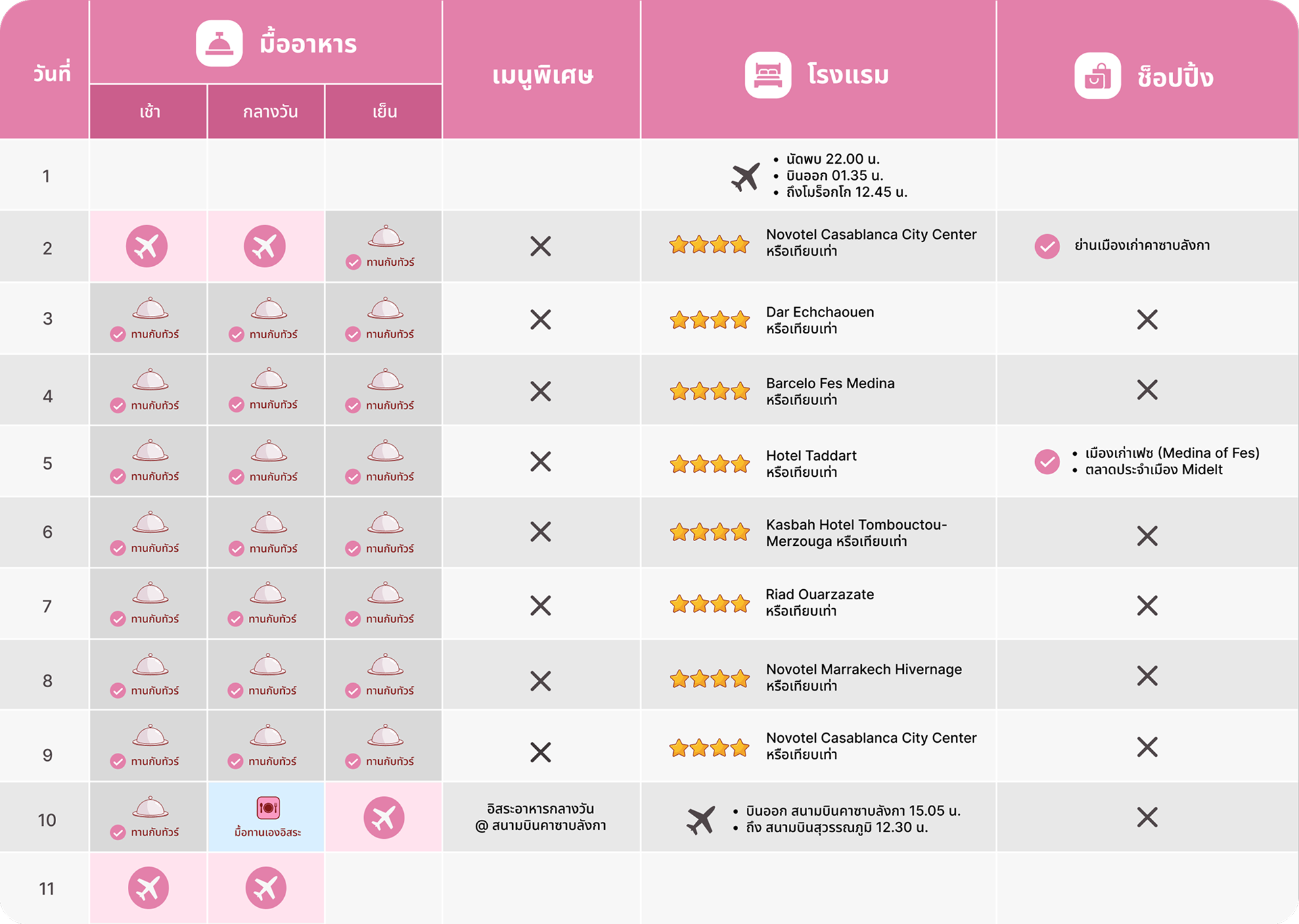 วันที่ 2 | 01.35 น.ออกเดินทางโดยสายการบิน เอมิเรตส์ (Emirates)(EK) *EK 385 (ใช้เวลาบินประมาณ 6 ชม.) **มีบริการอาหารระหว่างเที่ยวบินฮะ04.45 น.เดินทางถึง สนามบินดูไบ (DXB) ประเทศสหรัฐอาหรับเอมิเรตส์ (UAE) *แวะเปลี่ยนเครื่อง07.30 น.ออกเดินทางโดยสายการบิน เอมิเรตส์ (Emirates)(EK) *EK 751 (ใช้เวลาบินประมาณ 8.45 ชม.) **มีบริการอาหารระหว่างเที่ยวบินฮะ12.45 น.เดินทางถึง สนามบินคาซาบลังกา (Casablanca Mohammed V International Airport)(CMN) - คาซาบลังกา (Casablanca)บ่ายเที่ยวชม ย่านเมืองเก่าคาซาบลังกา (Old Medina | Casablanca Old Town | Medina in Casablanca) - เข้าชม สุเหร่าแห่งกษัตริย์ฮัสซันที่ 2 | มัสยิดฮัซซันที่สอง (Hassan II Mosque) - ชายหาดคาซาบลังกา (La Corniche | Corniche Casablanca) |