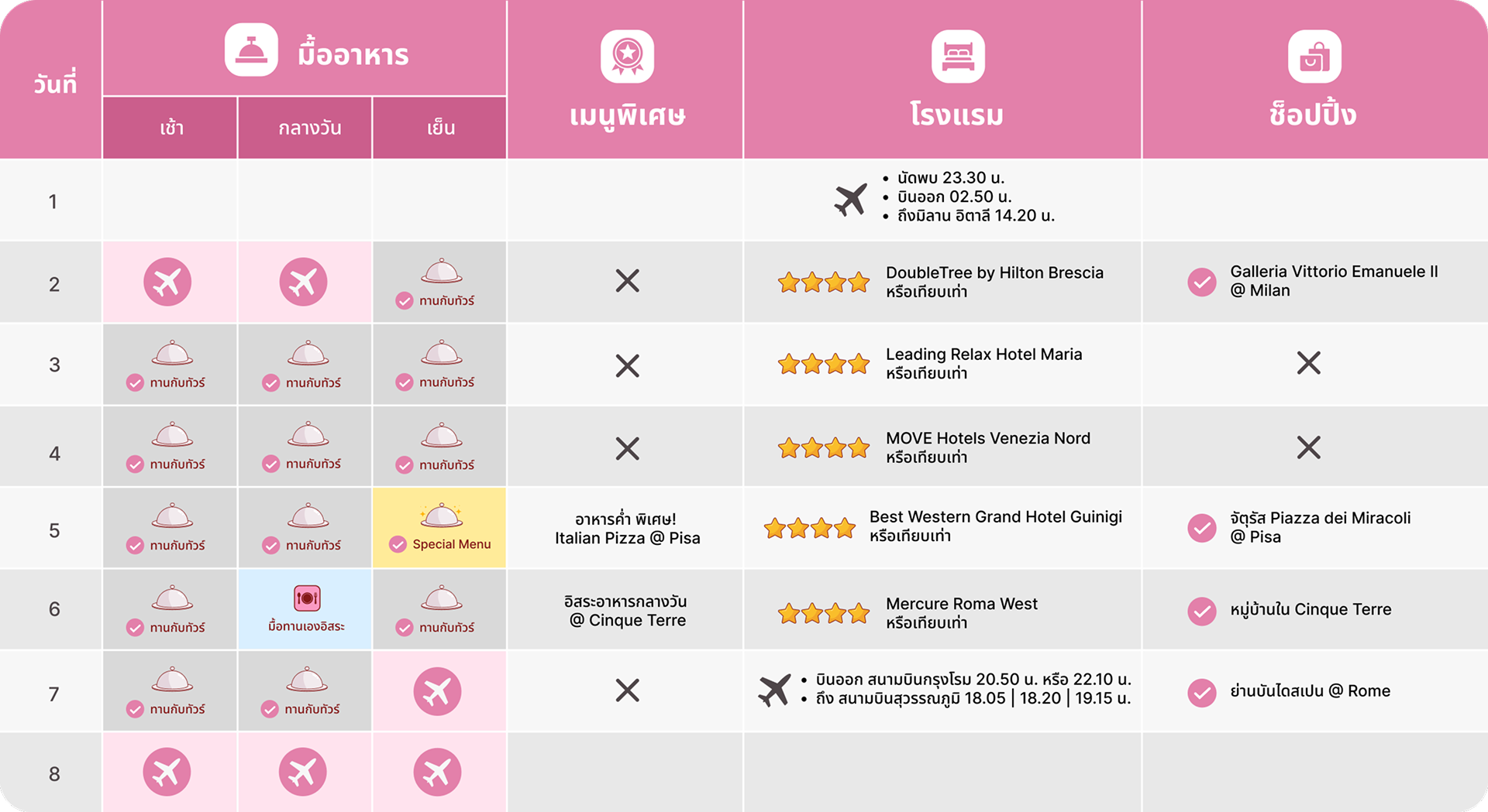 วันที่ 7 | เช้าRome Italy - เดินทางสู่ นครรัฐวาติกัน (Vatican City) - ถ่ายรูปกับ มหาวิหารเซนต์ปีเตอร์ (ST. Peter Basilica) - ซุ้มเซนต์ปีเตอร์ (St. Peter's baldachin) - ผ่านชม โรมันฟอรัม | จัตุรัสโรมัน (Roman Forum) - ชม โคลอสเซียม | สนามกีฬาโคลอสเซียม (Colosseum)บ่ายน้ำพุเทรวี (Trevi Fountain) - ช้อปปิ้งย่าน บันไดสเปน (Spanish Steps)17.30 น.เดินทางสู่ สนามบินโรม | สนามบินเลโอนาร์โด ดา วินชี-ฟีอูมีชีโน (Aeroporto Leonardo da Vinci di Fiumicino)(FCO)** สำหรับคณะที่ออกเดินทาง 29 ธ.ค.68 - 5 ม.ค.69 / 25 ก.พ. 4 มี.ค.69 / 19-26 มี.ค.69 เที่ยวบินที่ EK 96 เวลาบินออกจากสนามบินปรับเป็น 20.50 น. เวลานัดหมายก่อนเดินทางสู่สนามบินปรับเป็น 16.30 น. ฮะ ** 22.10 น.ออกเดินทางโดยสายการบิน เอมิเรตส์ (Emirates)(EK) *EK 96 *มีบริการอาหารระหว่างเที่ยวบินฮะ |