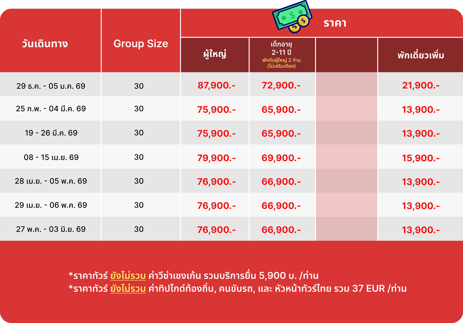วันที่ 8 | 05.50 น.เดินทางถึง สนามบินดูไบ (DXB) ประเทศสหรัฐอาหรับเอมิเรตส์ (UAE) *แวะเปลี่ยนเครื่อง ออกเดินทางโดยสายการบิน เอมิเรตส์ (Emirates)(EK) *EK 372 *มีบริการอาหารระหว่างเที่ยวบินฮะ ** สำหรับคณะที่ออกเดินทาง 29 ธ.ค.68 - 5 ม.ค.69 / 25 ก.พ. 4 มี.ค.69 / 19-26 มี.ค.69 ปรับเที่ยวบินเป็น เที่ยวบินที่ EK 370 เวลาบินออกจากสนามบินดูไบ 08.55 น. / 8-15 เม.ย.69 ปรับเที่ยวบินเป็น เที่ยวบินที่ EK 370 เวลาบินออกจากสนามบินดูไบเวลา 09.00 น. ** 19.15 น.เดินทางถึง สนามบินสุวรรณภูมิ** สำหรับคณะที่ออกเดินทาง 29 ธ.ค.68 - 5 ม.ค.69 / 25 ก.พ. 4 มี.ค.69 / 19-26 มี.ค.69 ปรับเที่ยวบินเป็น เที่ยวบินที่ EK 370 เวลาบินถึงสนามบินสุวรรณภูมิ 18.05 น. / 8-15 เม.ย.69 ปรับเที่ยวบินเป็น เที่ยวบินที่ EK 370 เวลาบินถึงสนามบินสุวรรณภูมิ 18.20 น. ฮะะ ** |