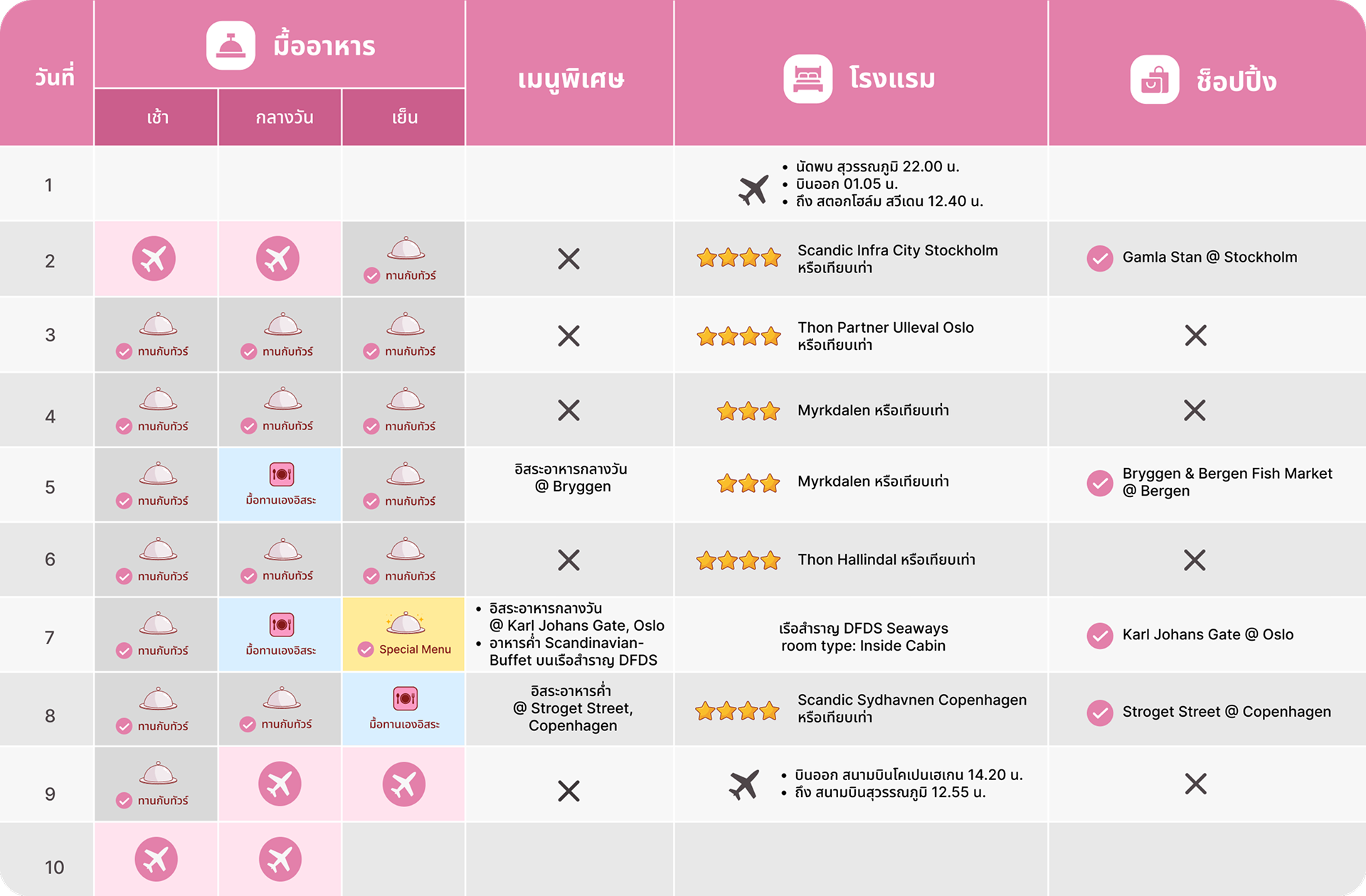 วันที่ 2 | 01.05 น.ออกเดินทางโดยสายการบิน เอมิเรตส์ (Emirates)(EK) *EK 385 **มีบริการอาหารระหว่างเที่ยวบินฮะ05.00 น.เดินทางถึง สนามบินดูไบ (DXB) ประเทศสหรัฐอาหรับเอมิเรตส์ (UAE) *แวะเปลี่ยนเครื่อง08.20 น.ออกเดินทางโดยสายการบิน เอมิเรตส์ (Emirates)(EK) *EK 157 **มีบริการอาหารระหว่างเที่ยวบินฮะ12.40 น.เดินทางถึง สนามบินสตอกโฮล์ม | สนามบินสตอกโฮล์ม อาร์ลันดา (Stockholm Arlanda Airport)(ARN) ประเทศสวีเดน - สตอกโฮล์ม (Stockholm)บ่ายเที่ยวชม กรุงสต็อกโฮล์ม - ถ่ายรูปคู่กับ ศาลาว่าการสตอกโฮล์ม (Stockholm City Hall | Stadshuset) - แกมล่าสแตน | เมืองเก่ากัมลาสตัน (Gamla Stan) - ถ่ายรูปที่ระลึกกับ พระราชวังหลวงสตอกโฮล์ม | พระราชวังสตอกโฮล์ม (Stockholm Palace | Stockholms slott | Kungliga slottet) |