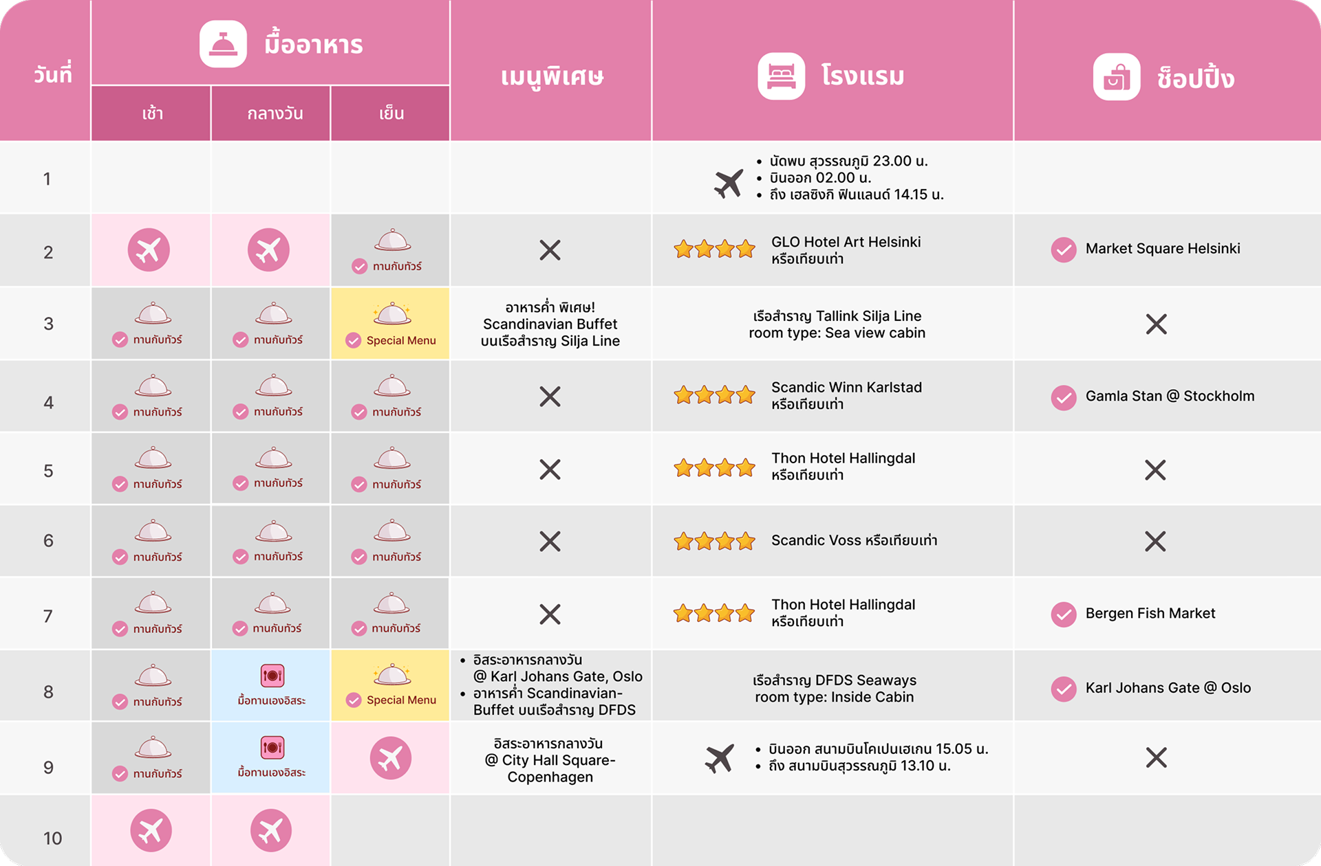 วันที่ 2 | 02.00 น.ออกเดินทางโดยสายการบิน กาตาร์แอร์เวย์ (Qatar Airways)(QR) *QR 837 **มีบริการอาหารบนเครื่อง05.30 น.เดินทางถึง สนามบินฮาหมัด หรือ สนามบินโดฮา (Hamad International Airport)(DOH) ประเทศกาตาร์ (แวะเปลี่ยนเครื่อง)08.10 น.ออกเดินทางโดยสายการบิน กาตาร์แอร์เวย์ (Qatar Airways)(QR) *QR 6122 **มีบริการอาหารบนเครื่อง14.15 น.เดินทางถึง สนามบินเฮลซิงกิ | สนามบินเฮลซิงกิ-วันตา (Helsinki-Vantaa Airport)(HEL) ประเทศฟินแลนด์ - เฮลซิงกิ (Helsinki) - ชม มาร์เก็ตสแควร์ เฮลซิงกิ (Market Square Helsinki | Kauppatori) - จัตุรัสเซเนท | เซเนทสแควร์ (Senate Square Helsinki) |