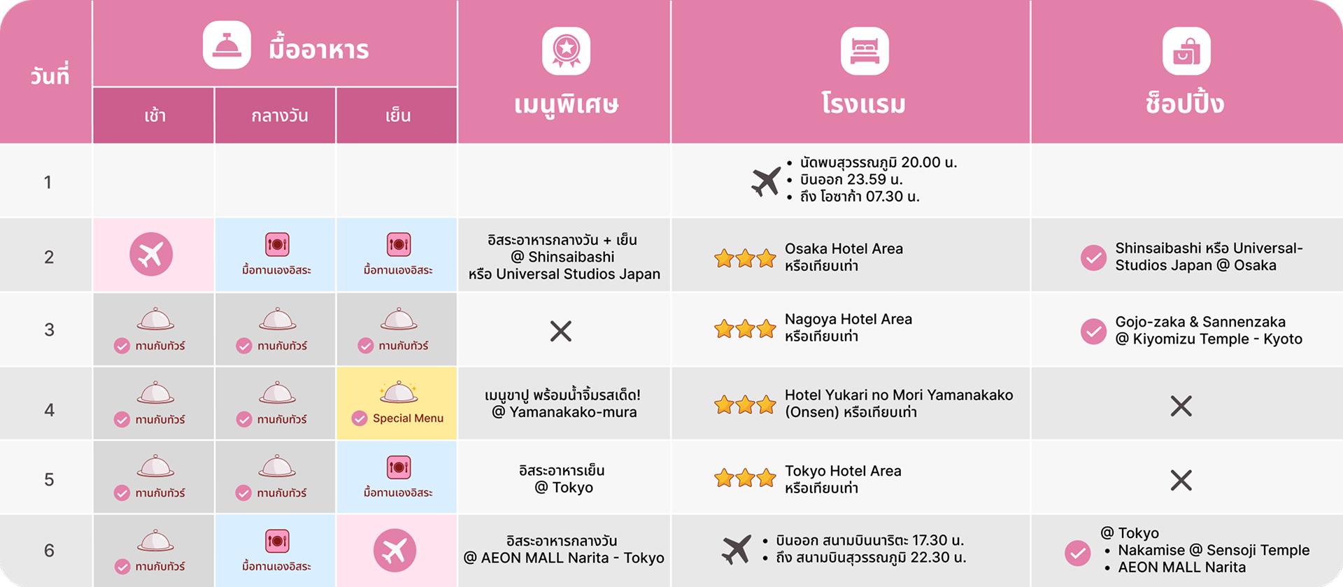 วันที่ 2 | 07.30 น.เดินทางถึง สนามบินคันไซ | สนามบินคันไซ โอซาก้า (Kansai Airport)(KIX) - โอซาก้า (Osaka)*รถบัสจะไปส่งคณะที่เข้าสวนสนุก Universal Studios Japan | ยูนิเวอร์แซล ญี่ปุ่น | ยูนิเวอร์แซล โอซาก้า ก่อน หลังจากนั้นนำท่านอื่นที่ไม่ได้ไปสวนสนุก เดินทางสู่โอซาก้า* *ตอนเย็นรถบัสจะไปรับเราที่สวนสนุก Universal Studios Japan ก่อนเข้าโรงแรม กรณีที่เราอยู่ดึก จะต้องกลับโรงแรมเองฮะ (ต้องนำสัมภาระติดตัวไปด้วย - สามารถฝากของไว้ที่ตู้ฝากด้านนอกทางเข้าสวนสนุกได้* (ท่านที่ไม่ได้ไปสวนสนุก) เดินทางสู่ วัดคัตสึโอจิ | วัดดารุมะ (Katsuoji Temple) - ศาลเจ้านัมบะ ยาซากะ (Namba Yasaka Shrine) - ช้อปปิ้ง ชินไซบาชิ | ย่านชินไซบาชิ (Shinsaibashi) *อิสระอาหารกลางวัน และ เย็น ฮะ |