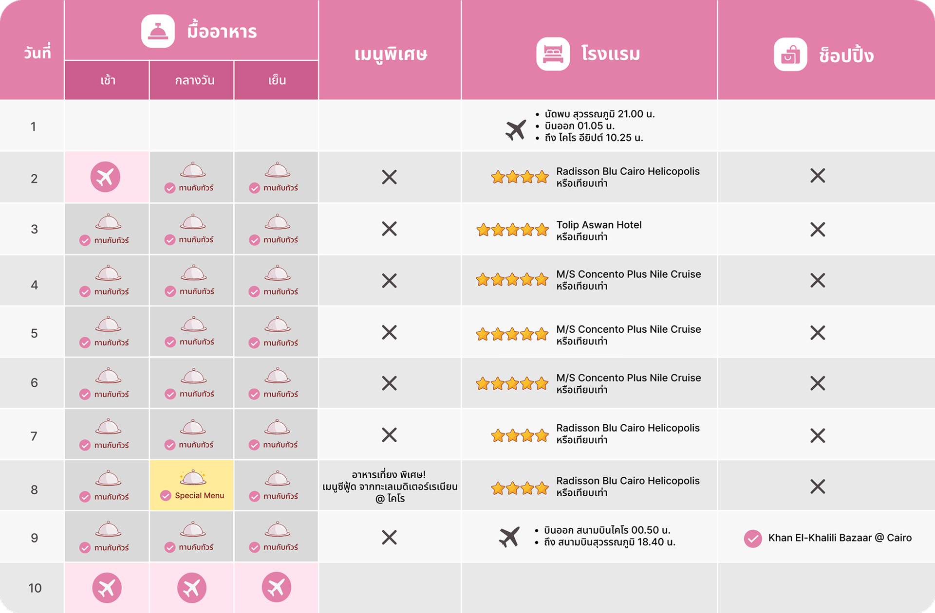 วันที่ 7 | เช้าLuxor - *Optional กิจกรรมขึ้นบอลลูนชมเมืองลักซอร์ยามเช้า ราคาประมาณ 150-180 USD ฮะ - หลังอาหารเช้า เช็คเอาท์จากเรือ - เดินทางสู่ ฝั่งตะวันตกของแม่นําไนล์ (West Bank) - เข้าชม วิหารเดียร์เอลบาฮารี (Deir El Bahari) - แวะถ่ายภาพ อนุสาวรีย์เมมนอน (Colossi of Memnon)บ่ายหุบเขากษัตริย์ (Valley of the Kings) - เข้าชม สุสาน 3 *ตั๋วมาตรฐานครอบคลุมสุสาน เช่น รามเสส IV (KV2), รามเสส IX (KV6), เมเรนปทา (KV8), รามเสส III (KV11), ทาวเซิร์ต-เซตนาคท์ (KV14), เซติ II (KV15), และ ซิปทา (KV47) เลือกเข้าได้ 3 ที่ฮะปล.ไม่รวมค่าเข้าชม สุสานฟาโรห์ตุตันคามุน EGP 700, สุสานฟาโรห์ตุตันคามุน EGP 2000, สุสานฟาโรห์ รามเสสที่ 5 & 6 EGP300 (ราคาค่าเข้าชมแต่ละสุสานอาจมีการเปลีนแปลงขึนอยู่กับประกาศของทางการประเทศอียิปต์ฮะ สอบถามมาเช็คได้อีกทีฮับ) - วิหารลุคซอร์ | วิหารลักซอร์ (The Temple of Luxor) ค่ำหลังอาหารค่ำ เดินทางสู่ สนามบินลักซอร์ (Luxor International Airport)(LXR)21.40 น.ออกเดินทางโดย อียิปต์แอร์ (EgyptAir)(MS) *MS 069 **ไม่มีบริการอาหารระหว่างเทียวบินฮะ22.50 น.เดินทางถึง สนามบินไคโร (Cairo International Airport)(CAI) - ไคโร (Cairo) |