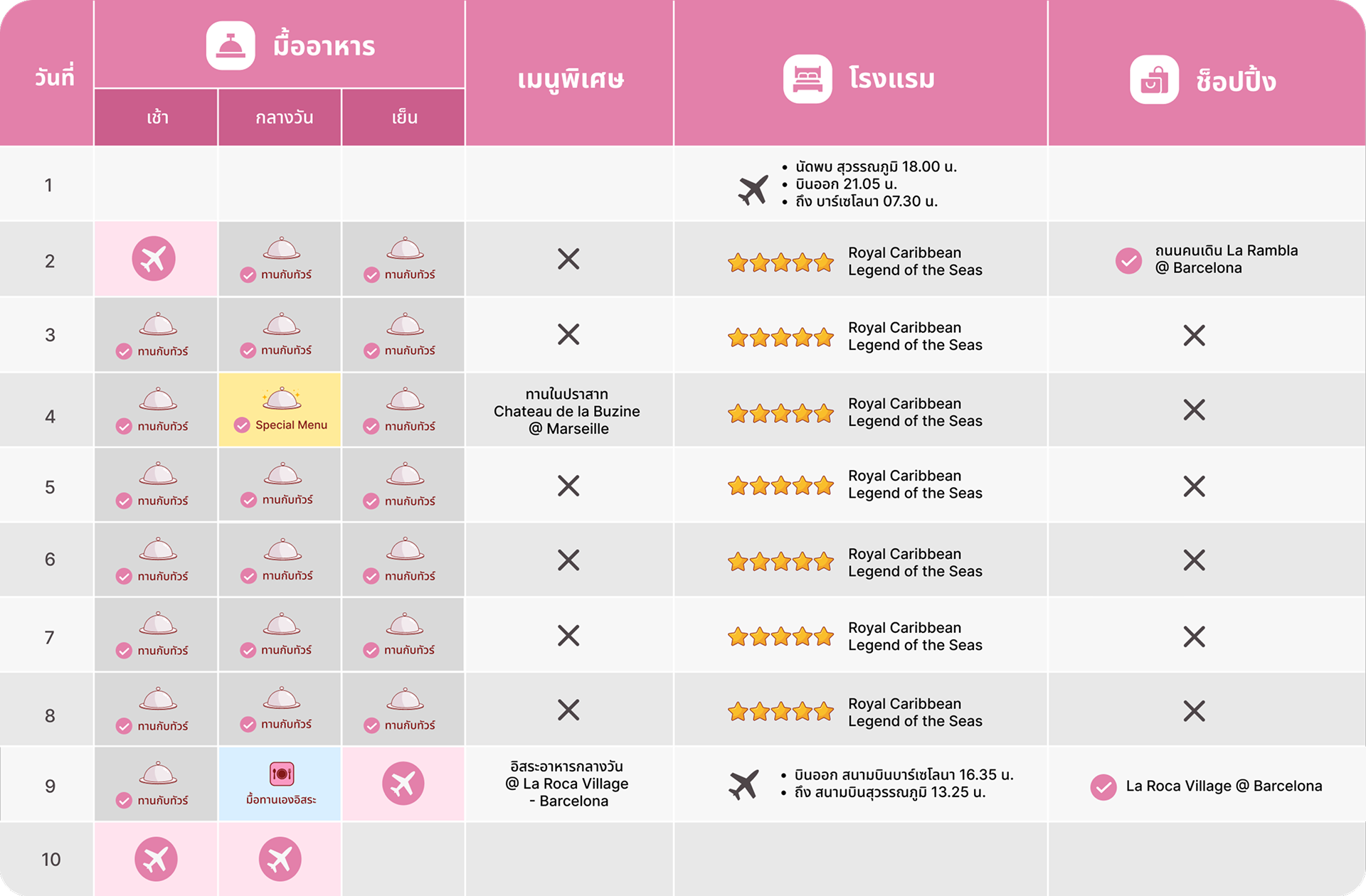วันที่ 9 | 05.00 น. เรือเทียบท่า ท่าเรือบาร์เซโลนา (สเปน)(Port de Barcelona | Moll Adossat)08.30 น. check out เรือสำราญ พร้อมรับกระเป๋าสัมภาระ09.30 น. เดินทางไปช้อปปิ้งที่ La Roca Village | La Roca Village Outlet*อิสระอาหารกลางวันฮะ